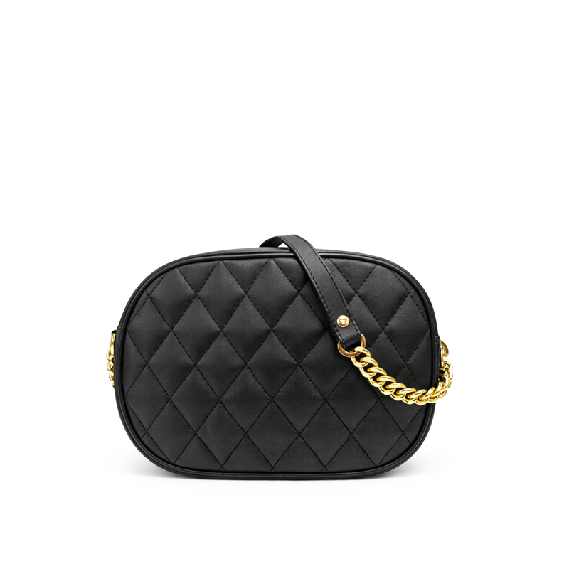 A contemporary oval camera bag featuring luxury diamond quilting, matte black leather, and a signature gold-tone chain. The ultimate day-to-night accessory for the modern minimalist.