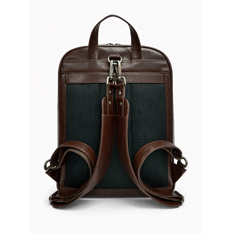 A sophisticated, slim-profile leather backpack in deep tobacco brown. Featuring ergonomic mesh backing and adjustable padded straps, it's the perfect blend of professional style and daily comfort.